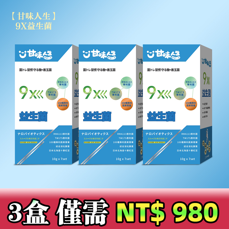 半小時前【甘味人生】9X益生菌 - 胡瓜輕鬆甩肉16公斤秘訣大公開 市售唯一次世代益生菌聯盟【益生菌+益生質+後生元】打造新時代益生菌纖瘦健康力 雙專利菌 加專利蔬果菁華 排便順暢 維持消化道機能 綜合消化酵素:幫助消化 燃燒代謝 佰億好菌 全家人都可以吃 9大菌株 6大專利 3大功能面面俱到 越活越青春!【10gx7set】 - 3盒 買二送一【甘味人生】9X益生菌 【限量99组】暴瘦4-6公斤!!-僅需 NT$980 【99%选择!!】