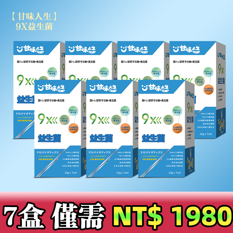 半小時前【甘味人生】9X益生菌 - 胡瓜輕鬆甩肉16公斤秘訣大公開 市售唯一次世代益生菌聯盟【益生菌+益生質+後生元】打造新時代益生菌纖瘦健康力 雙專利菌 加專利蔬果菁華 排便順暢 維持消化道機能 綜合消化酵素:幫助消化 燃燒代謝 佰億好菌 全家人都可以吃 9大菌株 6大專利 3大功能面面俱到 越活越青春!【10gx7set】 - 7盒 買六送一【甘味人生】9X益生菌 【限量199組】暴瘦15-20公斤!!-僅需 NT$1980